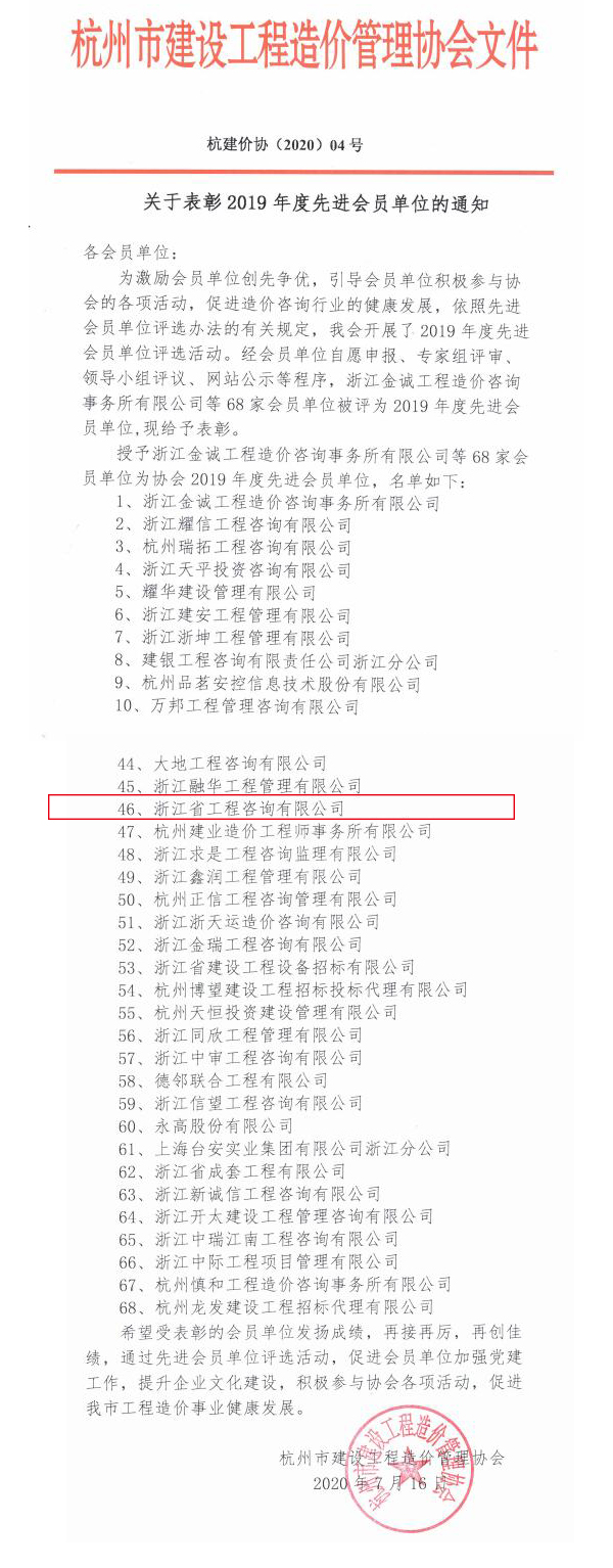 根据杭州市建设工程造价管理协会《关于开展2019年度先进会员单位评选活动的通知》和《先进会员单位评选办法》的规定,经会员单位自愿申报、专家组评审、领导小组评议、网站公示等程序,我公司被评为杭州市建设工程造价管理协会2019年度先进会员单位。