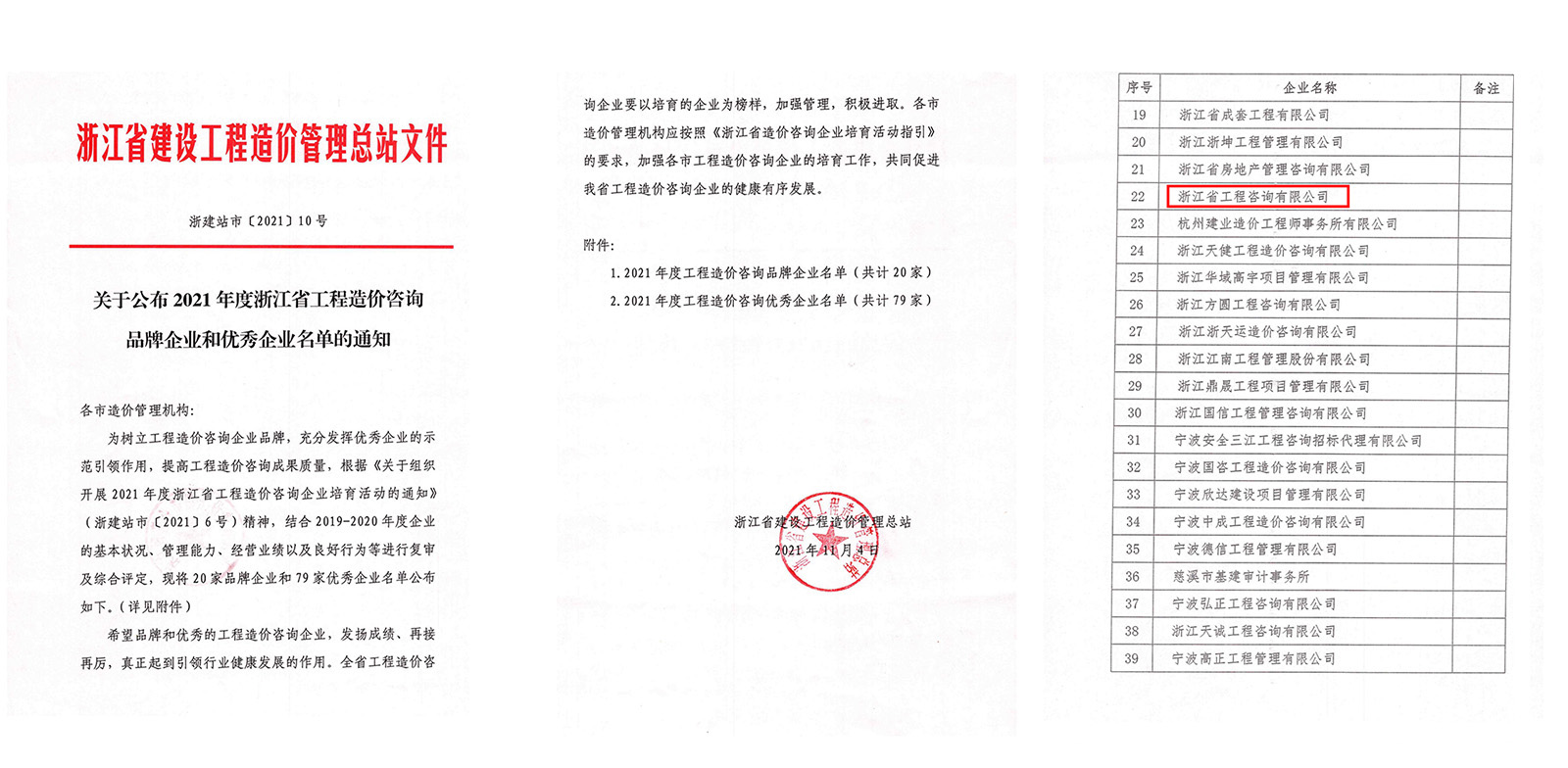 近日,浙江省建设工程造价管理总站根据《关于组织开展2021年度浙江省工程造价咨询企业培育活动的通知》(浙建站市〔2021〕6号)精神,结合2019-2020年度企业的基本状况、管理能力、经营业绩以及良好行为等进行复审及综合评定,评选出20家品牌企业和79家优秀企业,我公司凭借优异的表现,再次获得“浙江省工程造价咨询优秀企业”荣誉称号。