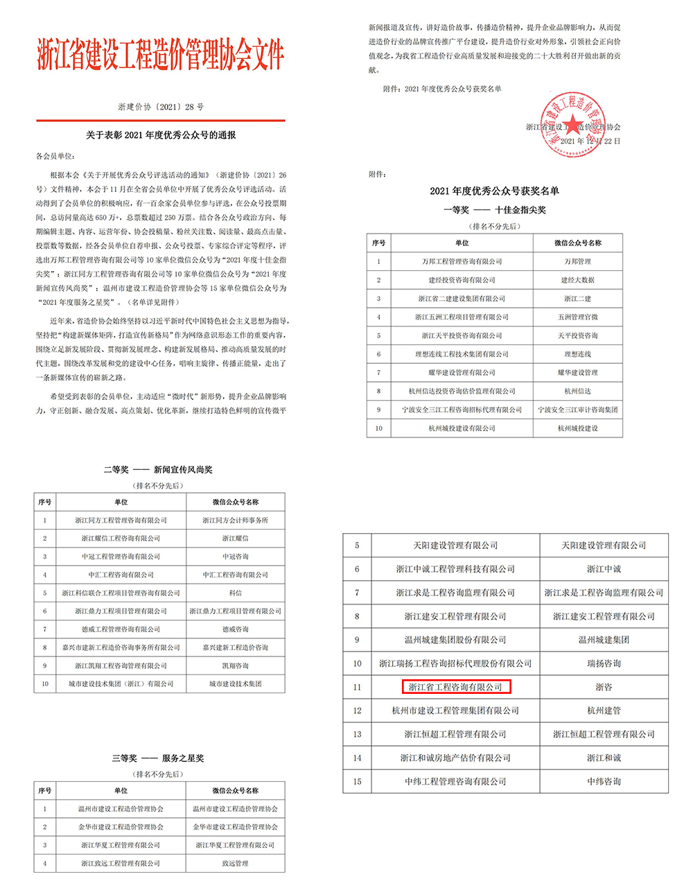 根据《关于开展优秀公众号评选活动的通知》(浙建价协〔2021〕26号)文件精神,浙江省建设工程造价管理协会于2021年11月在全省会员单位中开展了优秀公众号评选活动,有一百余家会员单位参与评选。我公司通过自荐申报、公众号投票、专家综合评定等程序,结合单位公众号的政治方向、每期编辑主题、内容、运营年份、协会投稿量、粉丝关注数、阅读量、最高点击量、投票数等数据,最终荣获“2021年度服务之星奖”。