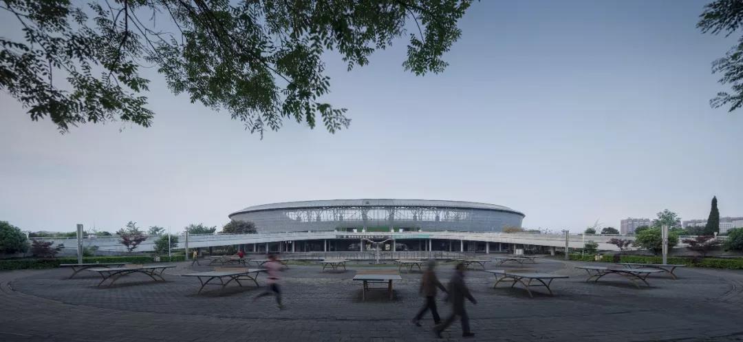 绵竹体育中心利用原未实施完成的旧体育场改造建设,原场地曾在2008年地震中临时存放罹难者遗体,新设计的主旨便被定义为“纪念”与“希望”。主体育场屋面既以双臂“环抱”的姿态守护对逝者的记忆,又以“舞动”的姿态激励生者的勇气。建筑北向广场中心设一处浅水,浅水水底藏一道勾缝,形成裂痕之路,两壁与底部以浮雕的形式记刻地震时期的故事:关于灾难、救助,以及生命的意义。与裂缝垂直方向设置烛台意向的圣火柱,既表达祭奠,又寓意希望。绵竹木板年画享有盛誉,设计选取其中意喻为“希望与丰收”的主题年画镂刻在建筑表皮的穿孔铝板纹样中,光线经外层镂空铝板的孔隙将年画投射在内层玻璃幕墙之上,使得整个新建筑光影层次丰富,地域特色鲜明灵动。