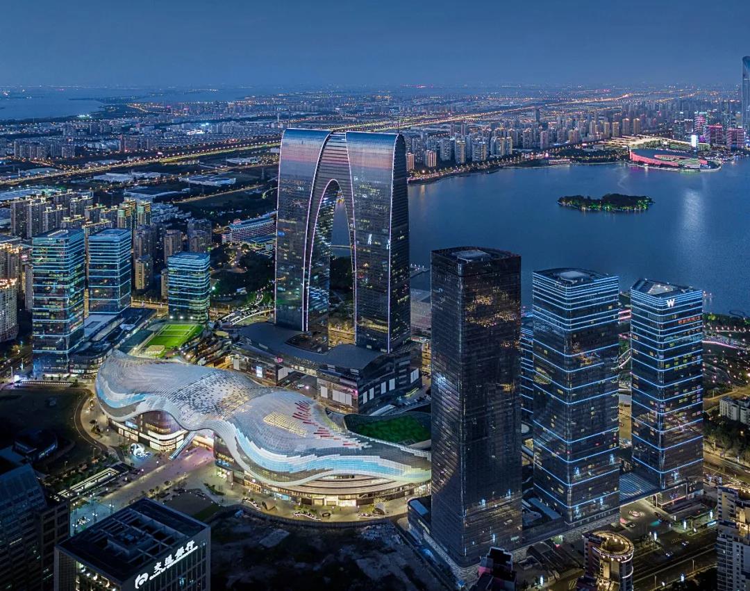 苏州中心位于苏州工业园区湖西CBD的中心,滨临金鸡湖畔,与东方之门一起,成为苏州市的重要地标、城市名片和顶级的商务商业中心,是新时代城市综合体项目的突出代表。作为城市的重要部分考虑,结合金鸡湖已有的景观,体现城市的职责和社会责任感,是集约利用土地资源,提升城市发展能级,树立城市地标性建筑的巨作。是集写字楼、商业、酒店、酒店式公寓、文化娱乐等多业态混合,融地上建筑与地下空间于一体的超大型城市综合体。