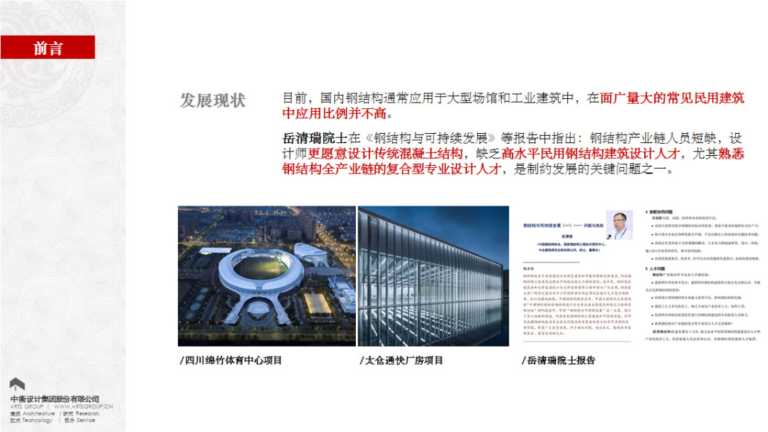 设计师在充分理解钢结构特性基础上,解决好稳定性、舒适度和防护等问题,钢结构可在如大跨、悬挑、高烈度地区、建筑表皮、景观小品,以及综合体等民用建筑中广泛应用。报告结合中衡设计相关工程案例进行了分析介绍。
