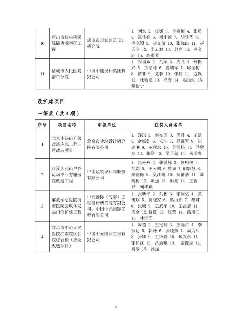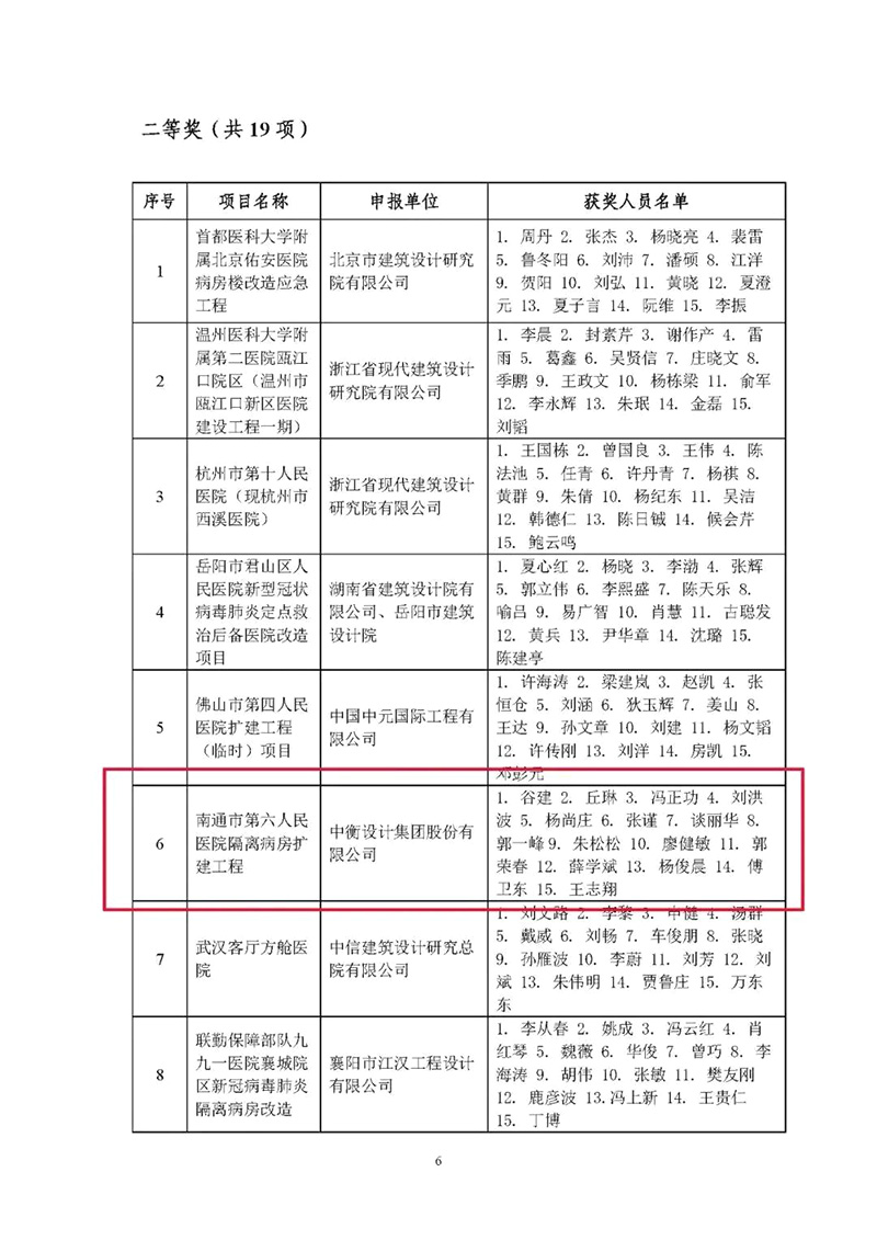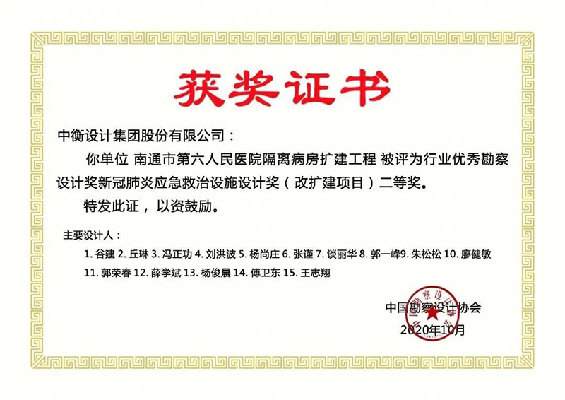 2020年10月,中国勘察设计协会行业优秀勘察设计奖新冠肺炎应急救治设施设计奖评选结果发布,武汉火神山医院应急项目、武汉雷神山医院项目等39个项目获奖,中衡设计集团股份有限公司设计的南通市第六人民医院隔离病房扩建工程项目获二等奖(改扩建项目)。