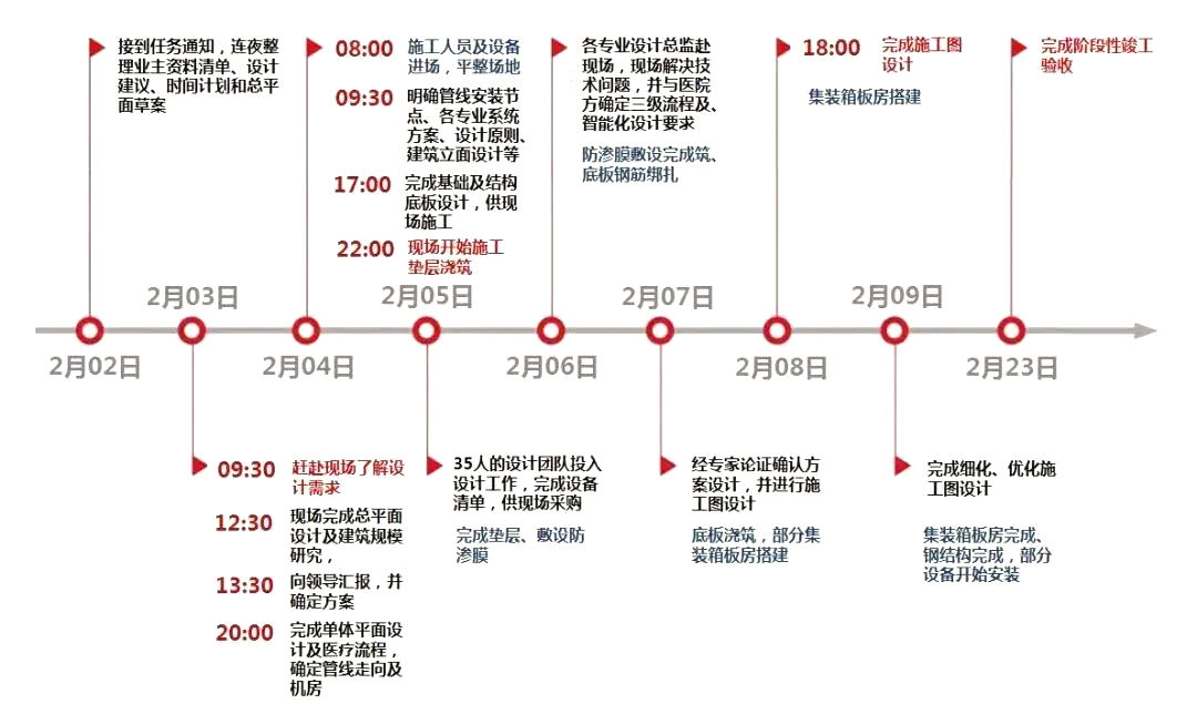 2月4日9:30,各专业方案沟通会议,明确管线安装节点、各专业系统方案、设计原则、建筑立面设计等,全面展开设计工作;同时联系集装箱式板房厂家等专项顾问公司,协调同步开展设计工作;17:00完成基础及结构底板设计,供现场施工;22:00,现场开始施工,垫层浇筑。2月5日,设计团队35人投入紧张的设计工作,完成设备清单,供现场采购。从2月3日至4日,约36小时便保证了现场顺利开工。