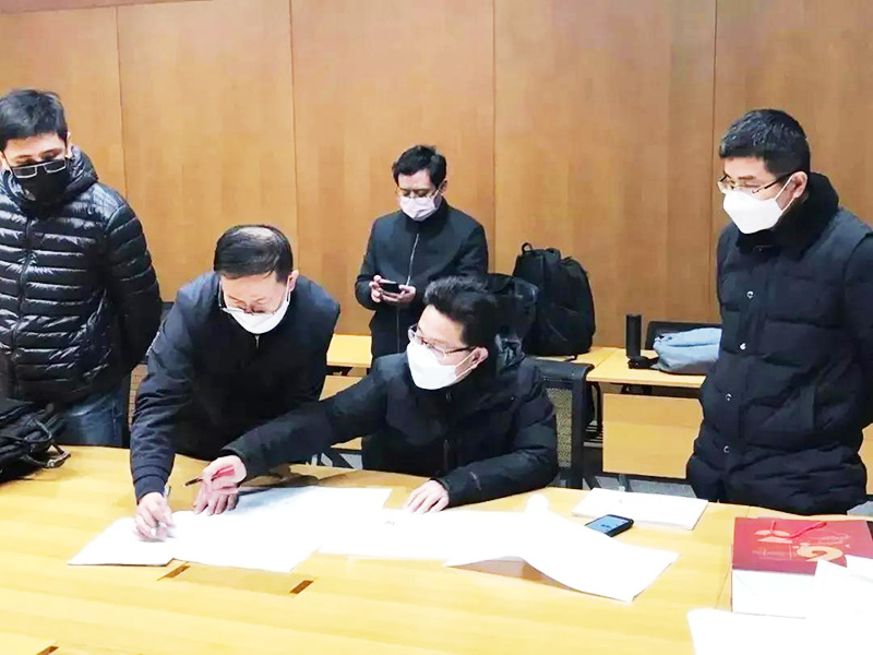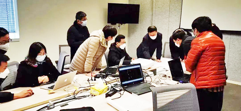 2月3日7:30,董事长冯正功亲自带领设计团队从苏州出发赶赴现场;9:30,与应急指挥部、住建部、医院方、总包施工方召开碰头会议、了解项目的具体需求;12:30,现场完成总平面方案设计;13:30,向领导汇报方案,并确定总体方案方向和原则;16:00,赴现场踏勘场地、了解原医院设施及图纸资料;20:00,谷建带领的北京分院的医疗设计团队完成平面布局初稿,各专业连夜确定主要管线走向及机房位置。