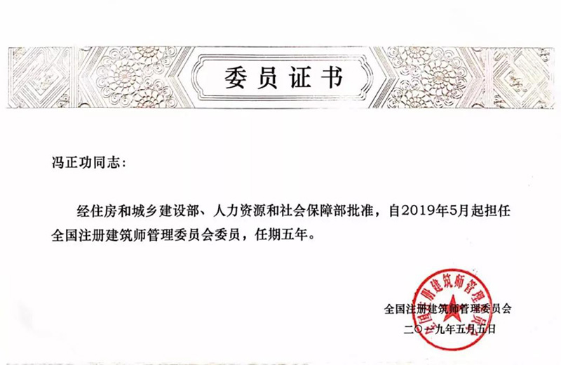 7月3日,全国注册建筑师管理委员会换届会议在北京召开,成立了新一届全国注册建筑师管理委员会,中衡设计集团董事长、总建筑师冯正功受聘为新一届全国注册建筑师管理委员会委员。