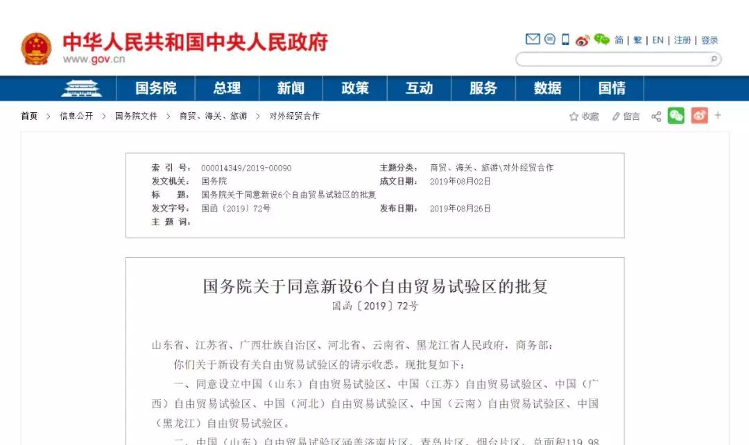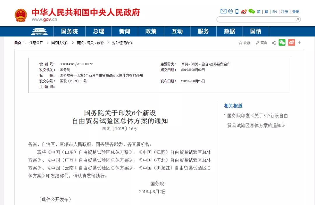 8月26日,中国政府网发文,国务院同意设立中国(山东)自由贸易试验区、中国(江苏)自由贸易试验区、中国(广西)自由贸易试验区、中国(河北)自由贸易试验区、中国(云南)自由贸易试验区、中国(黑龙江)自由贸易试验区等6个自由贸易试验区,同时发布了《中国(山东)自由贸易试验区总体方案》、《中国(江苏)自由贸易试验区总体方案》、《中国(广西)自由贸易试验区总体方案》、《中国(河北)自由贸易试验区总体方案》、《中国(云南)自由贸易试验区总体方案》、《中国(黑龙江)自由贸易试验区总体方案》等6个新设自由贸易试验区的方案。标志着江苏自贸区建设启幕。