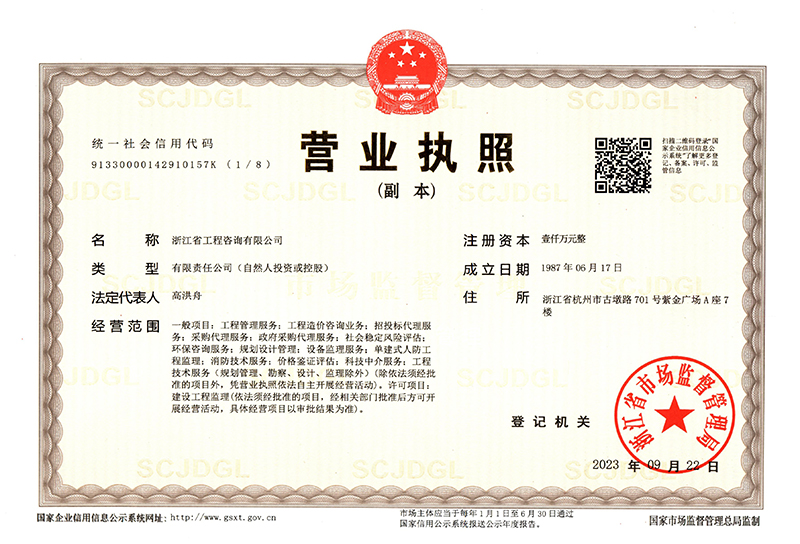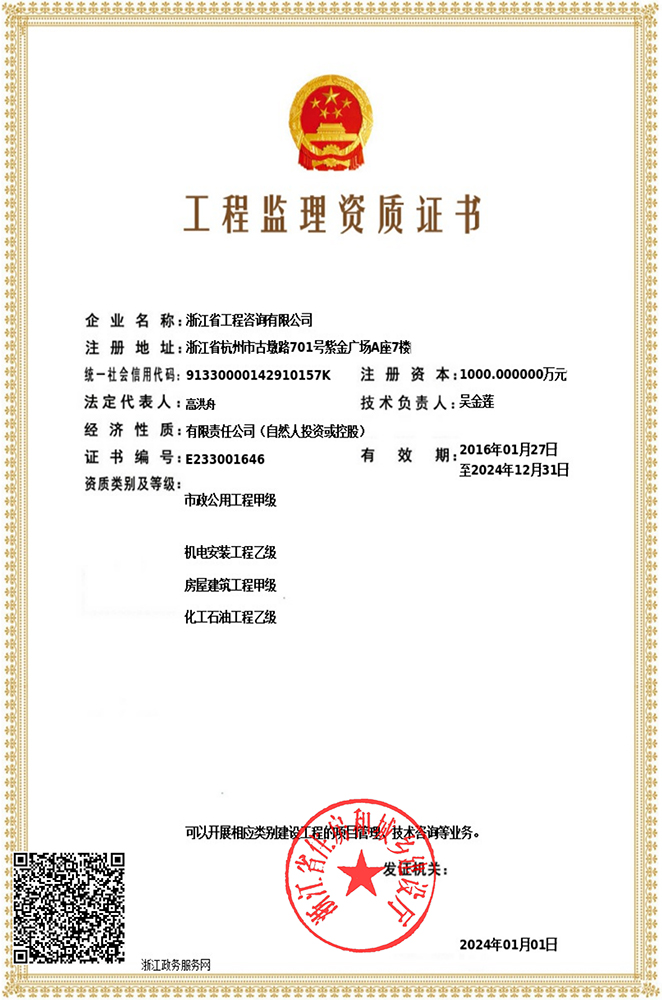 • 工程监理资质证书(房屋建筑工程甲级、市政公用工程甲级、机电安装工程乙级、化工石油工程监理乙级)
