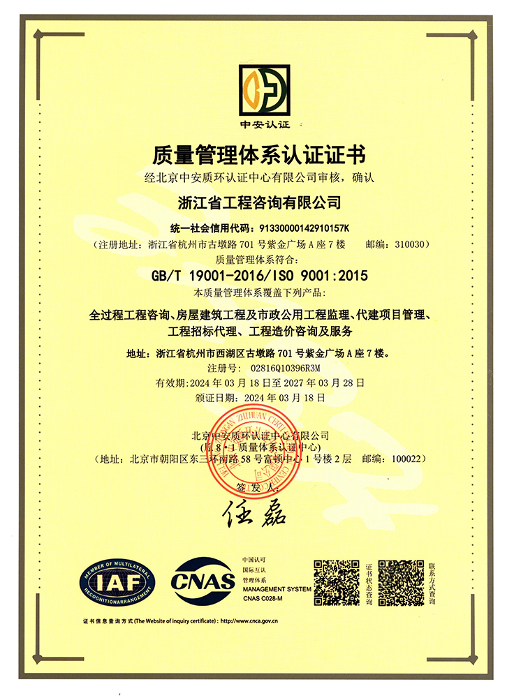 公司拥有覆盖全部服务领域的各项资质和资格,具有优良的资信。同时拥有一支专业理论扎实、实践经验丰富的工程建设管理人才队伍,其中中高级专业技术人员占专业技术人员总数的75%以上。拥有国际PMP项目管理师、咨询工程师(投资)、造价工程师、招标师、监理工程师等各类具备执业资格的专业技术人员,以及由涵盖国民经济和社会发展诸多领域的专家组成的专家库,为项目的高效实施提供强有力的技术支持。公司已通过ISO9001质量管理体系、ISO14001环境管理体系、OHSAS28001职业健康安全管理体系和信息安全体系四体系认证,经过不断实践和改进,已经形成一套标准、规范、科学的管理体系。
